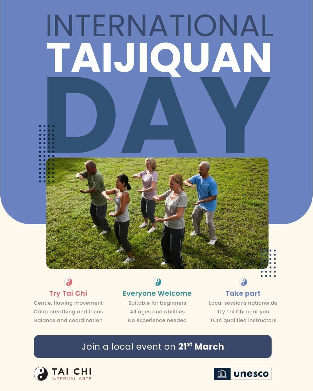 This growing resource provides members with ready-to-use materials to promote their local events for UNESCO International Taijiquan Day. It includes a press release template and guidance as well as canva templates to help you present your event clearly and professionally. Members are encouraged to personalise the materials with their own details and adapt them to suit their local audience and venue.